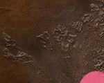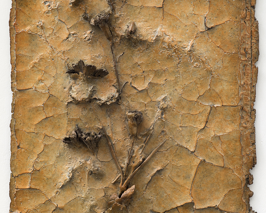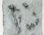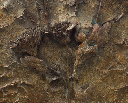 In Dreaming in Braille (2012) flowers are pressed in plaster and then cast in molten bronze. The resulting wall-pieces hover between painting and sculpture. These 'solid negatives' with their swirling, baroque marks and impressions – created by the imprinted crushed petals and surrounding swirls of material – encourage further associations with painting and with the gestural brush-mark, suggesting human emotion caught and suspended in bronze forever.